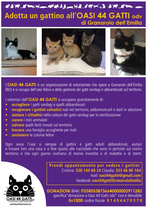 Per fare una donazione IBAN: IT53R0538736640000002911282 specificando “Donazione a Oasi 44 Gatti odv” (detraibile 5x1000: codice fiscale 91404470378).
