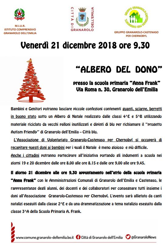 Le Amministrazioni Comunali di Granarolo dell'Emilia e Castenaso, insieme all’Istituto Comprensivo di Granarolo, partecipano anche quest’anno all’iniziativa di solidarietà “Albero del dono”.
