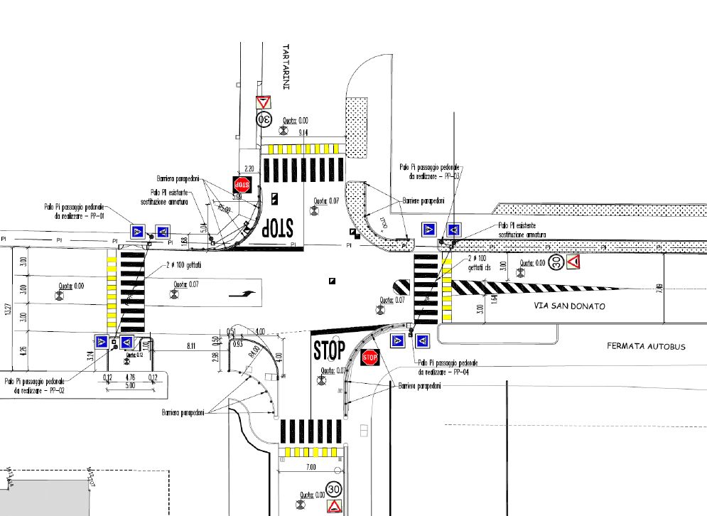 I lavori prevedono il rialzamento di tutta l’intersezione, compresi gli attraversamenti pedonali, una nuova illuminazione e un sistema di parapedoni, come da foto di progetto in copertina. Inoltre, si provvederà al rifacimento del manto stradale nel tratto che va dall'incrocio San Donato/Tartarini fino alla S. P. Lungosavena.