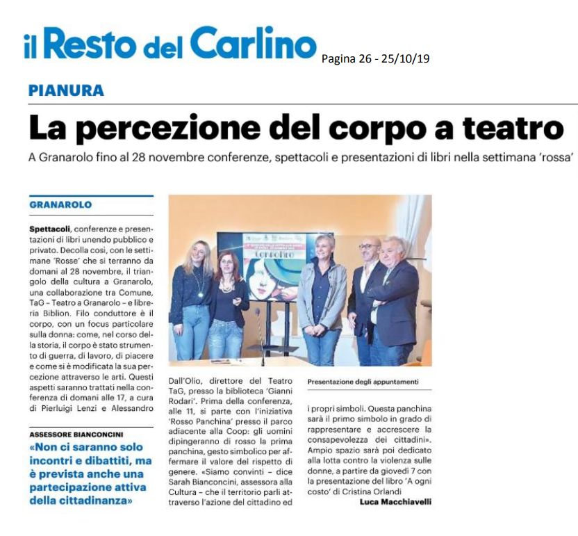 'Il Resto del Carlino' di venerdì 25 ottobre ha dedicato ampio spazio alla rassegna "Corporeo" delle Settimane Rosse, nate dalla collaborazione tra il Comune, il teatro TaG e la libreria Biblion: nove appuntamenti, dal 26 ottobre al 28 novembre, per partecipare alla festa della storia e alle celebrazioni della lotta contro la violenza alle donne.