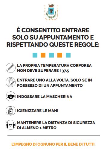 Si può accedere ai servizi comunali se non si ha la febbre (oltre 37.5°) o altri sintomi influenzali, dopo aver fissato un appuntamento con il servizio desiderato. L'ingresso in municipio è regolato da un operatore, che farà entrare gli utenti dopo aver verificato la presenza dell'appuntamento, della mascherina e dell'igienizzazione delle mani. Verrà inoltre rilevata la temperatura tramite un termoscanner.