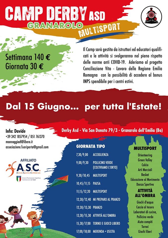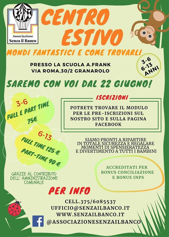 - Iscrizioni ed informazioni: tel. 375.6085537 - email ufficio@senzailbanco.it - sito web http://www.senzailbanco.it/campi-estivi-granarolo/ - FB https://www.facebook.com/associazionesenzailbanco/