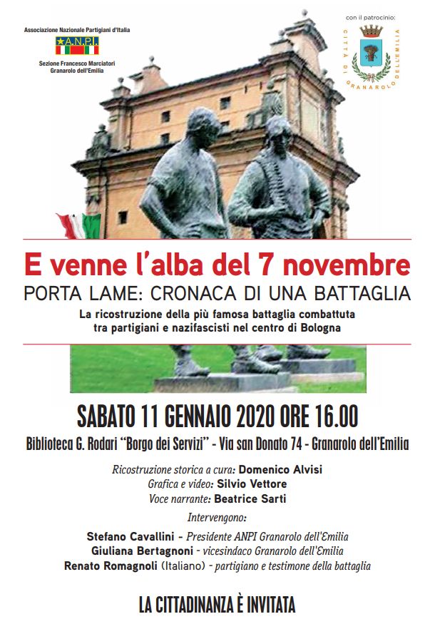 I cittadini sono invitati all'iniziativa curata da ANPI Granarolo "Porta Lame: cronaca di una battaglia", che si terrà sabato 11 gennaio alle 16.00 presso la biblioteca Gianni Rodari (evento rinviato lo scorso 13 dicembre, causa neve).