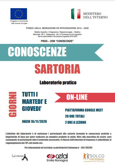 Nel mese di novembre partiranno due corsi on line gratuiti di sartoria e pelletteria, nell'ambito del progetto co-finanziato dall’Unione Europea "FONDO ASILO, MIGRAZIONE ED INTEGRAZIONE 2014 – 2020. PROG – 2550 CONOSCENZE”.