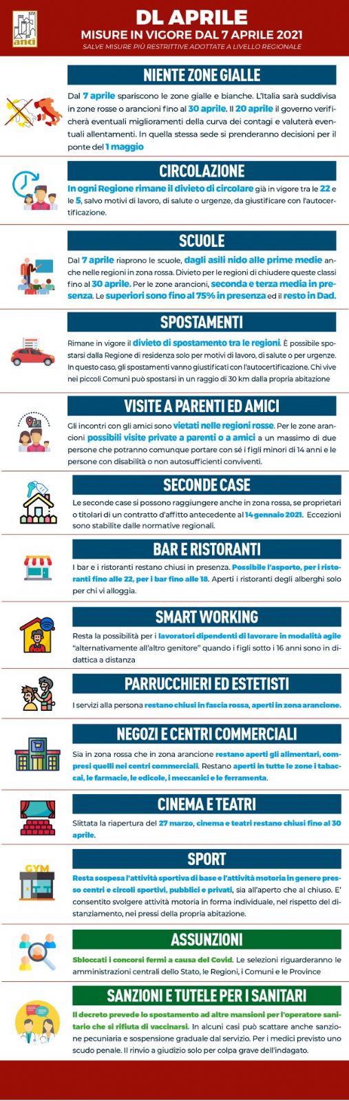 L’Italia sarà suddivisa in zone rosse o arancioni fino al 30 aprile. Il 20 aprile il governo verificherà eventuali miglioramenti della curva dei contagi e valuterà eventuali allentamenti. In quella stessa sede si prenderanno decisioni per il ponte del 1 maggio.
