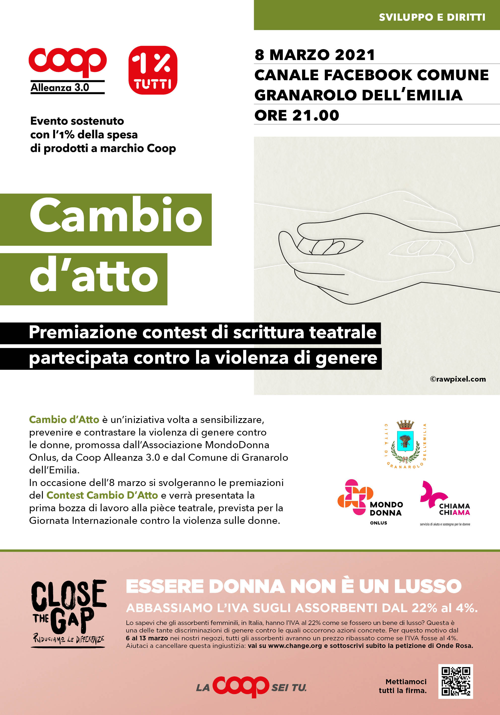ore 21 - Premiazione del progetto "Cambio d'atto", contest di scrittura teatrale partecipata contro la violenza di genere. Questo progetto è volto a sensibilizzare, prevenire e contrastare la violenza di genere contro le donne, promossa dall’Amministrazione comunale insieme all’Associazione MondoDonna Onlus Onlus e Coop Alleanza 3.0. Attraverso la raccolta di materiali prodotti dalle cittadine e dai cittadini, intende coinvolgere e sensibilizzare sempre più l’opinione pubblica sul tema della violenza di genere contro le donne, promuovendone la partecipazione al fine di facilitare e supportare azioni che vedano nell’impegno collettivo un efficace strumento di contrasto ad un fenomeno socio-culturale drammaticamente diffuso.