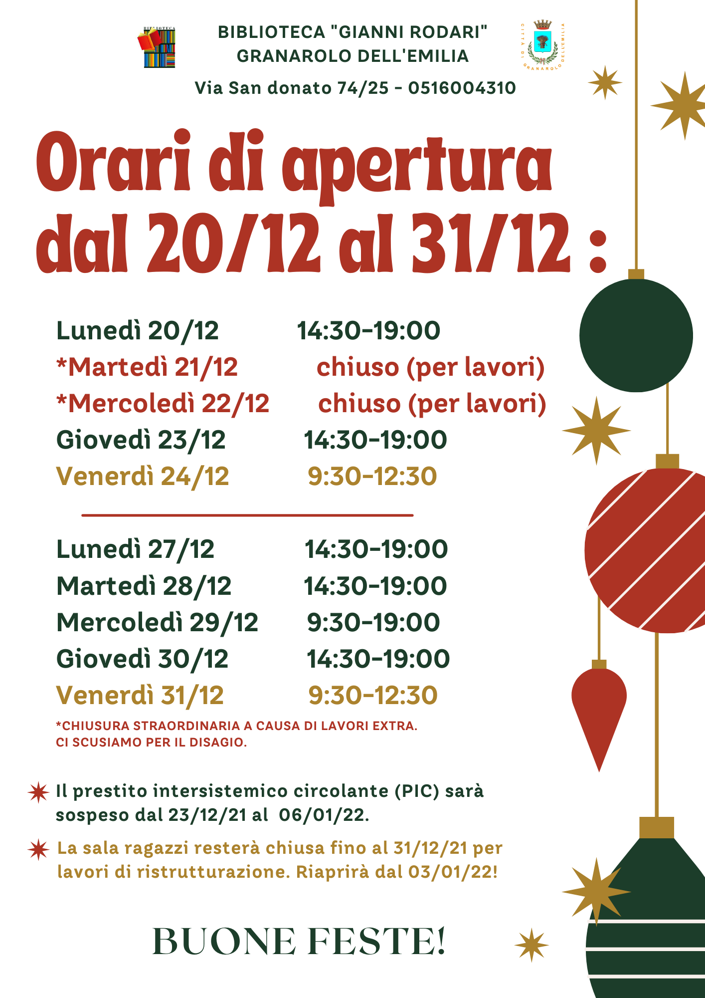 La sola “Sala Ragazzi”, in cui sarà anche necessario collocare nuovi arredi, riaprirà lunedì 3 gennaio.