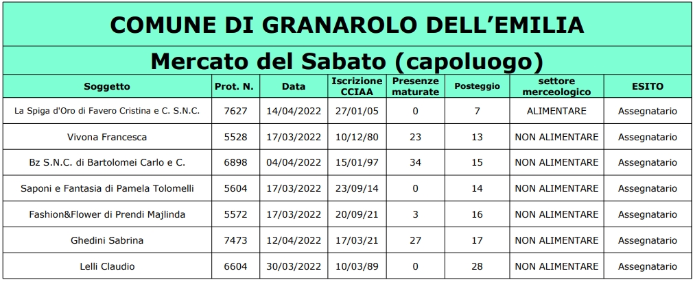 Nel documento allegato le assegnazioni per il mercato di Piazza 8 marzo.