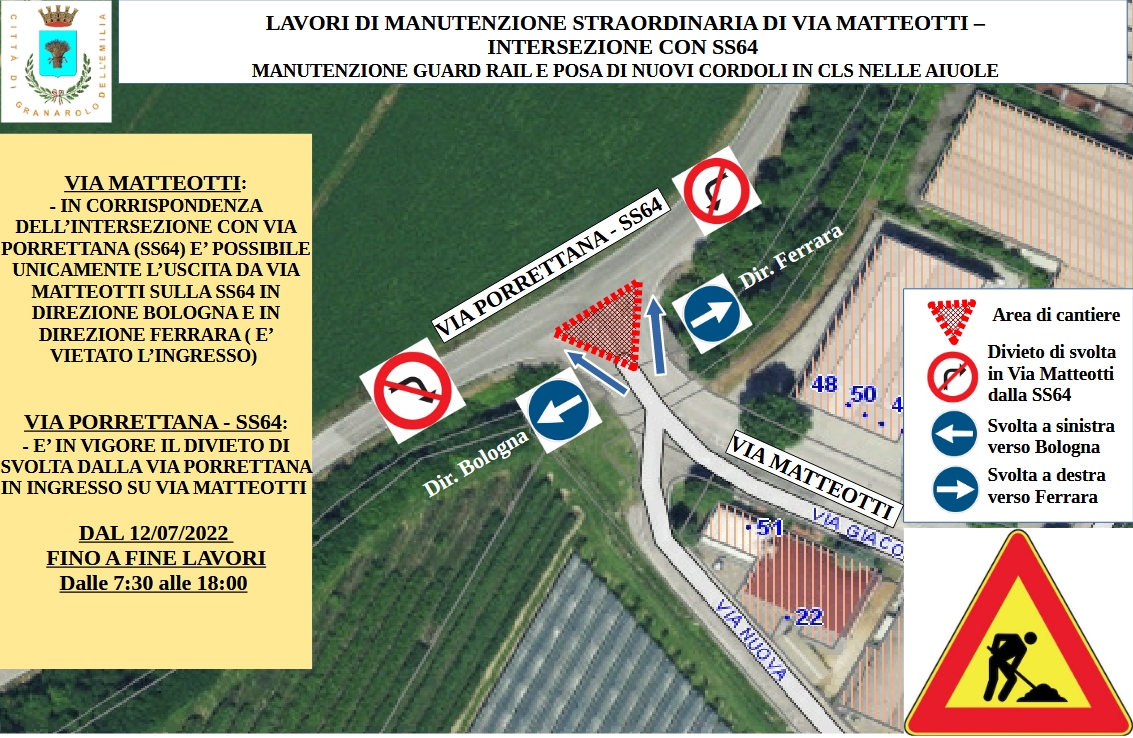 - Dalla Porrettana SS64 vigerà il divieto di svolta in ingresso su Via Matteotti, dal 12 luglio fino a fine lavori;