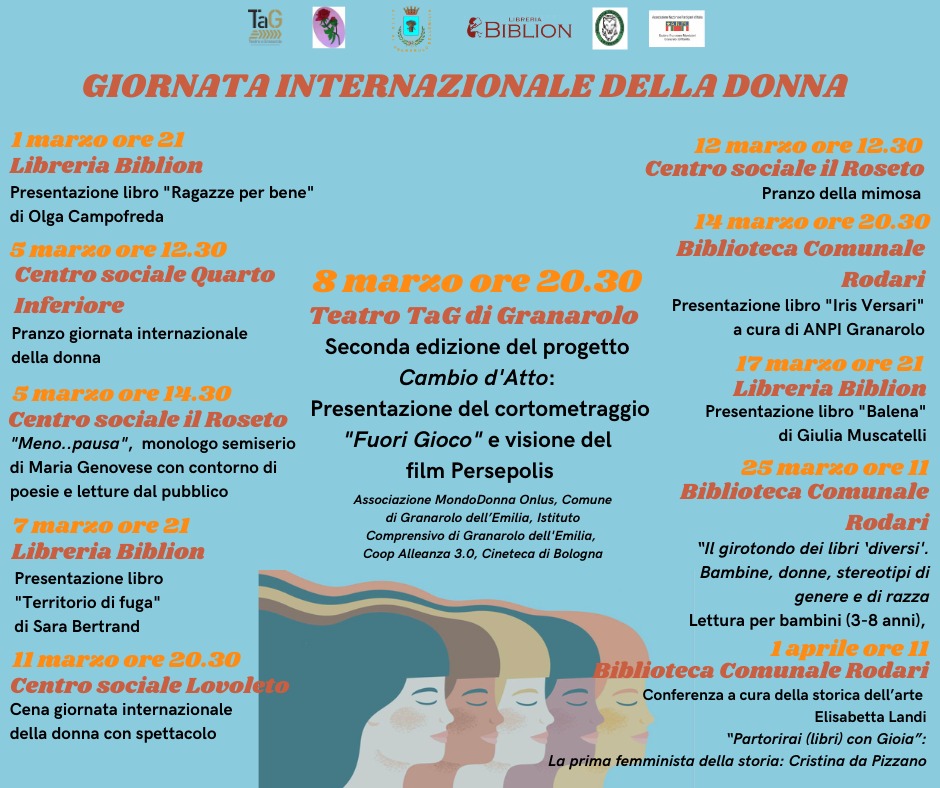 Mercoledì 8 marzo l'evento centrale al Tag - Teatro a Granarolo alle ore 20.30: Associazione MondoDonna Onlus, Comune di Granarolo dell’Emilia, Coop Alleanza 3.0 Schermi e Lavagne | Dipartimento educativo della Fondazione Cineteca di Bologna presentano "FUORI GIOCO", un cortometraggio dell’ Istituto Comprensivo di Granarolo dell’Emilia - Scuola Secondaria Matteucci. L’evento rientra nel progetto Cambio d’atto - Seconda edizione del Contest artistico contro la violenza di genere. Interverranno rappresentanti degli enti e associazioni partecipanti al progetto. Seguirà quindi la proiezione di "PERSEPOLIS", un film tratto dall’omonima graphic novel autobiografica di Marjane Satrapi.