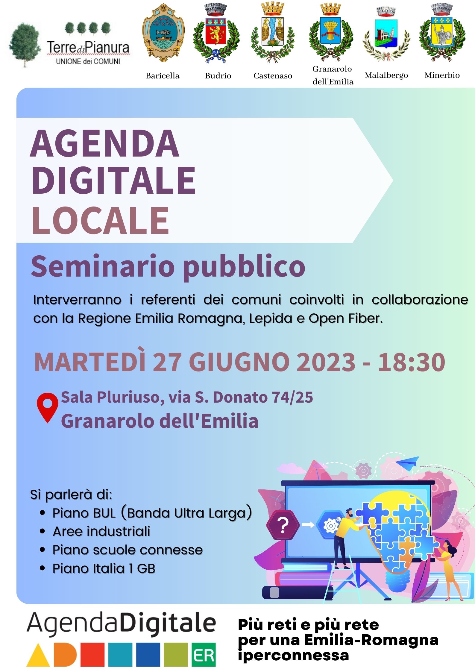 Se ne parlerà in un seminario pubblico – con anche diretta streaming (link: https://meet.google.com/bhc-fvfa-jpu) – martedì 27 giugno alle ore 18.30 nella Sala Pluriuso di Granarolo dell'Emilia (Via San Donato 74/25), nell’ambito delle iniziative all’insegna dello slogan “Più reti e più rete per una Emilia-Romagna iperconnessa”.