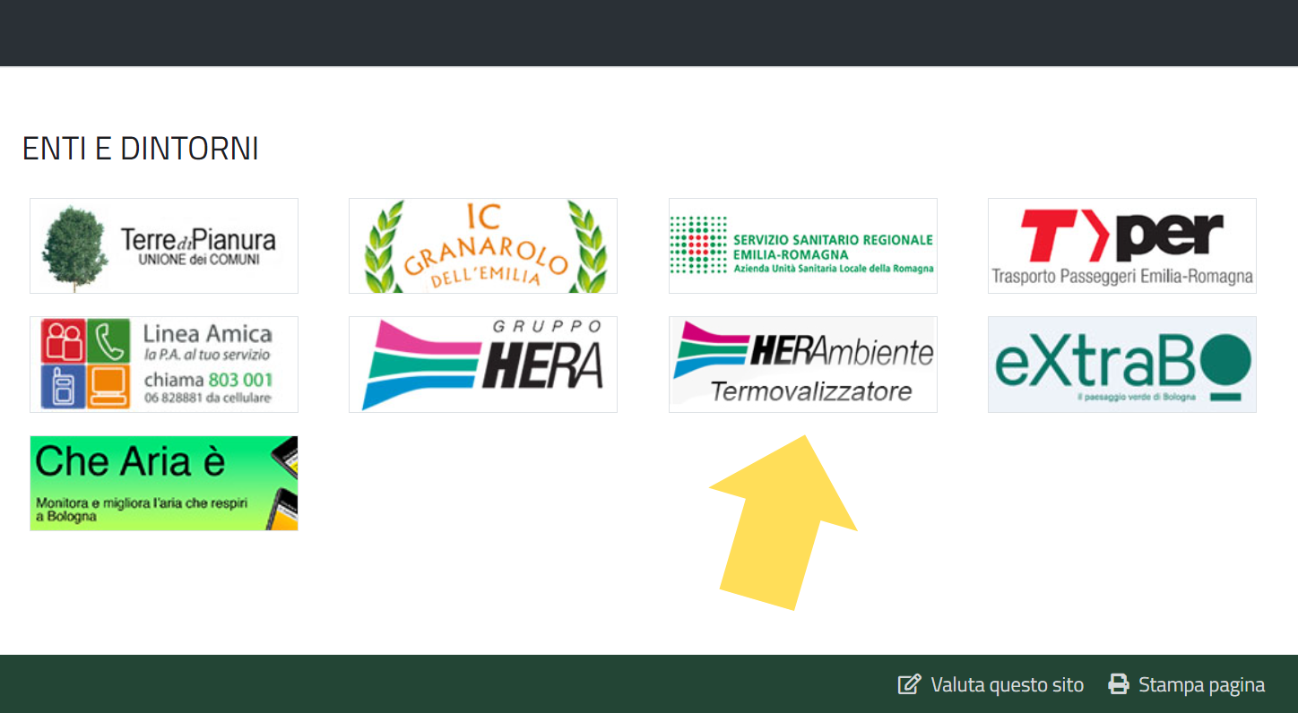 Il link alla pagina "Herambiente Termovalorizzatore" è presente nella parte bassa della homepage del sito del Comune, tra i bottoni che rimandano a diversi servizi di "Enti e dintorni". Nella foto dell'articolo la freccia indica il bottone da cliccare per andare alla pagina del termovalorizzatore.