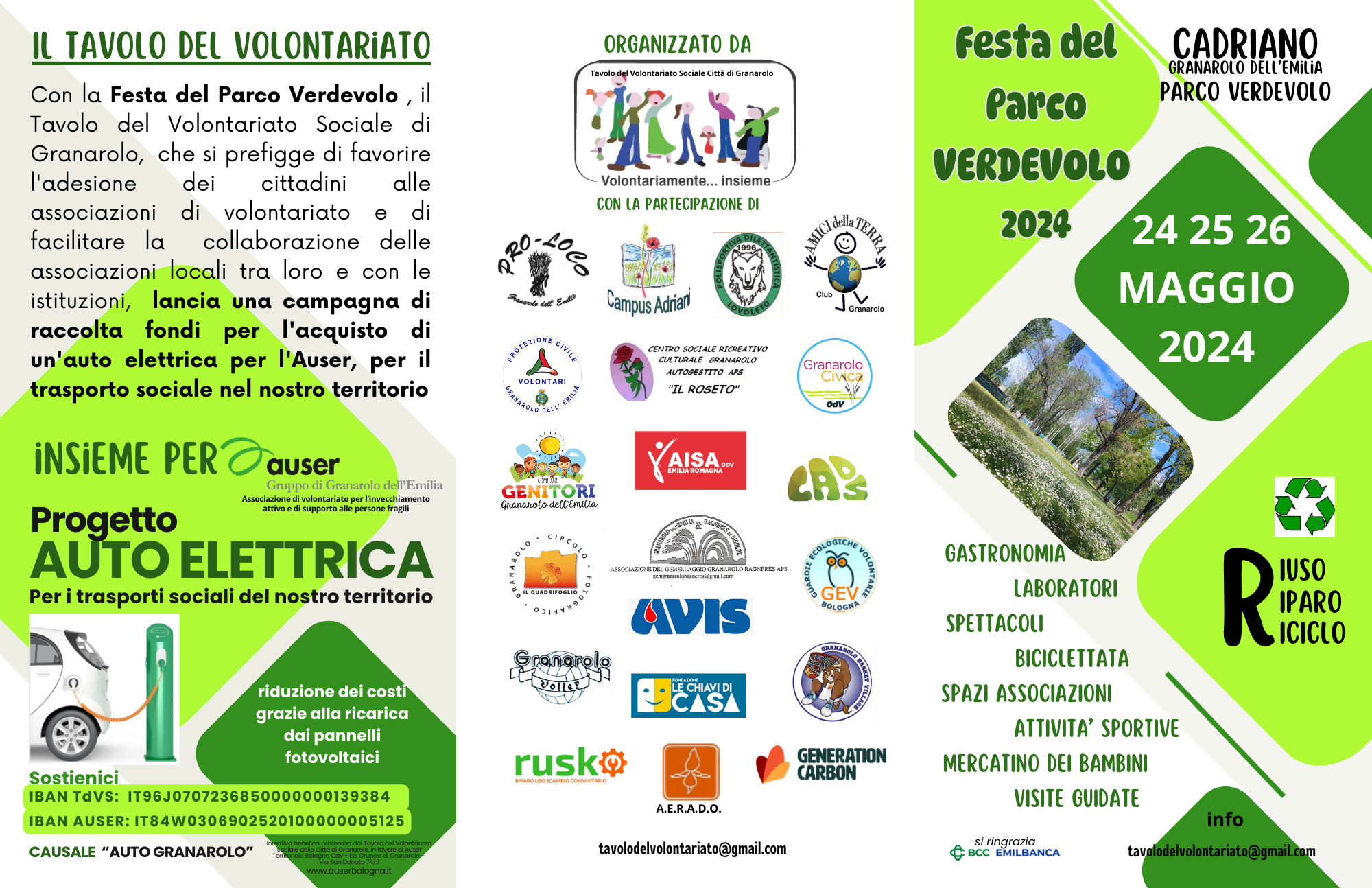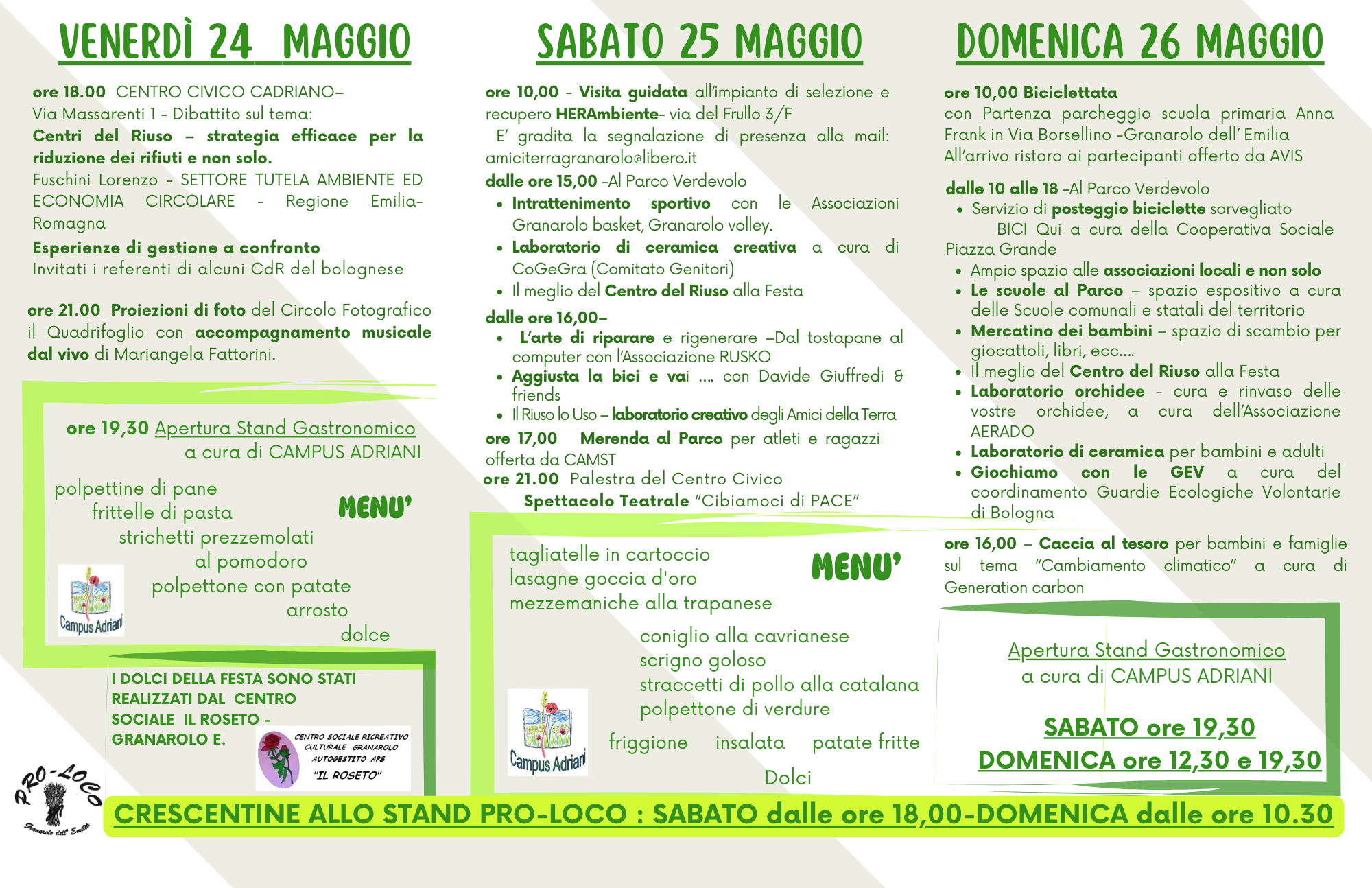 Torna dal 24 al 26 maggio il tradizionale appuntamento con la festa dell’ambiente di Granarolo dell’Emilia al Parco Verdevolo di Cadriano. Quest’anno la festa è organizzata dalle associazioni facenti parte del Tavolo del Volontariato Sociale di Granarolo. Il programma, curato da Amici della Terra, tiene al centro, come sempre, i temi della sostenibilità: il focus di questa edizione è: “Riuso, Riparo, Riciclo”.
