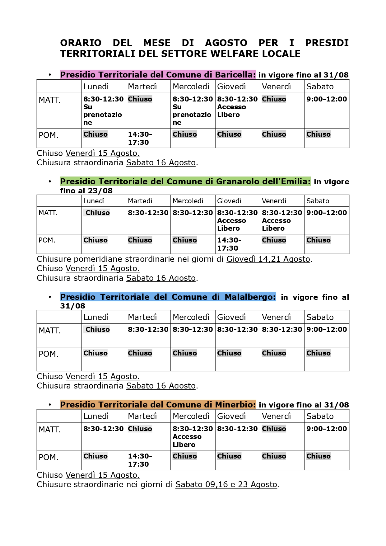 Si informano i cittadini dell’Unione Terre di Pianura che nel mese di Agosto 2025, i presidi territoriali del Settore Welfare Locale dell’Unione Terre di Pianura subiranno delle modifiche all’orario di apertura al pubblico, come riportato nello schema allegato.