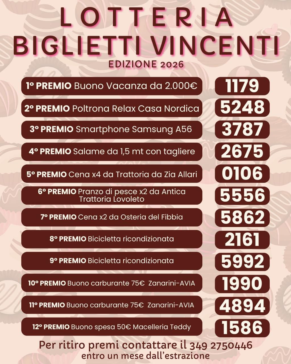 I possessori dei biglietti vincenti sono invitati a verificare i numeri estratti e a procedere al ritiro entro un mese dalla data dell’estrazione, contattando il numero 349 2750446 per concordare le modalità.