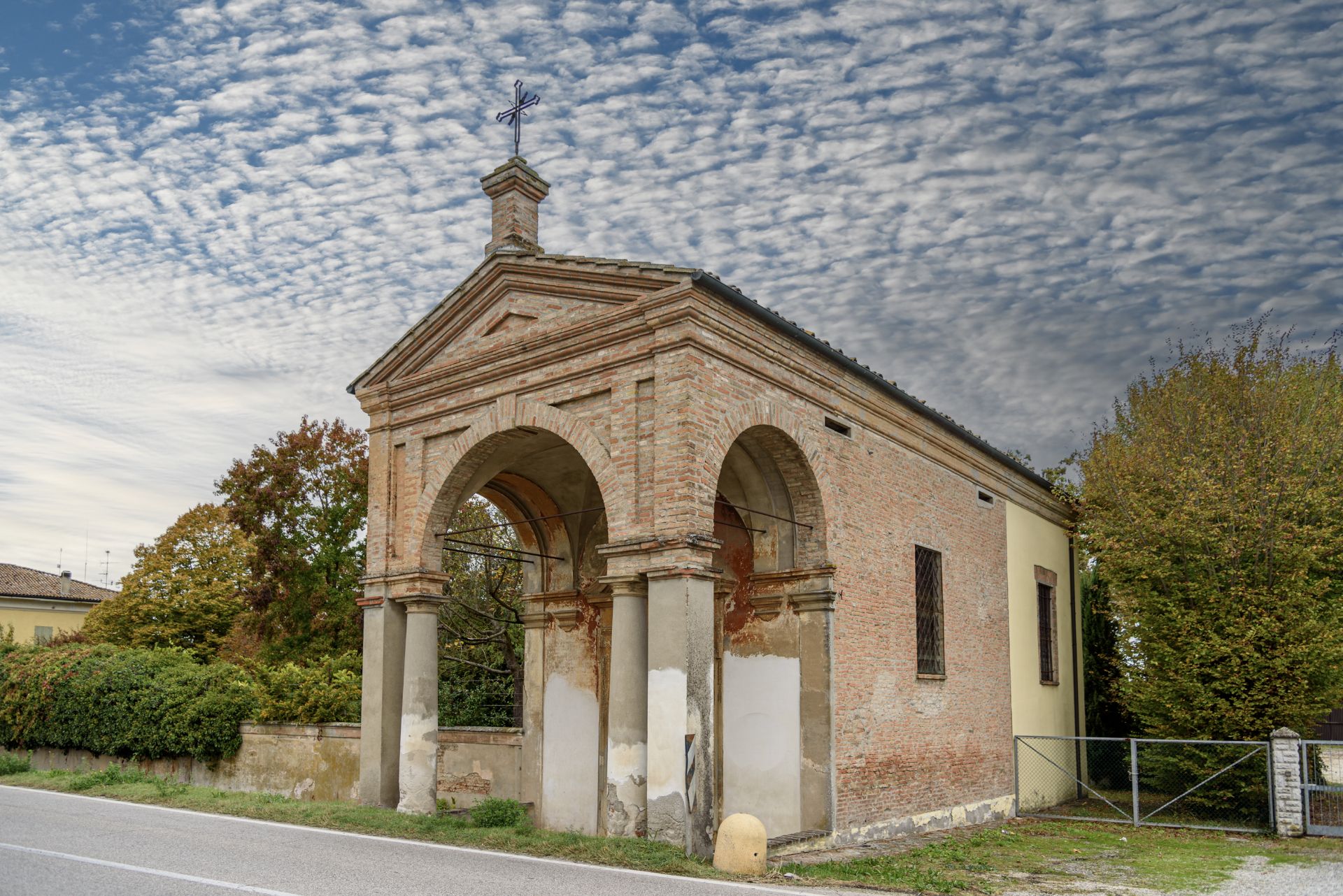 Caratteristico è il pronao che scavalca il fosso lungo la via Ferrarese e che fungeva da riparo per la sosta e la preghiera del viandante che, attraverso le grate poste ai lati della porta, poteva sempre evocare la sacra immagine splendente sull’altare.