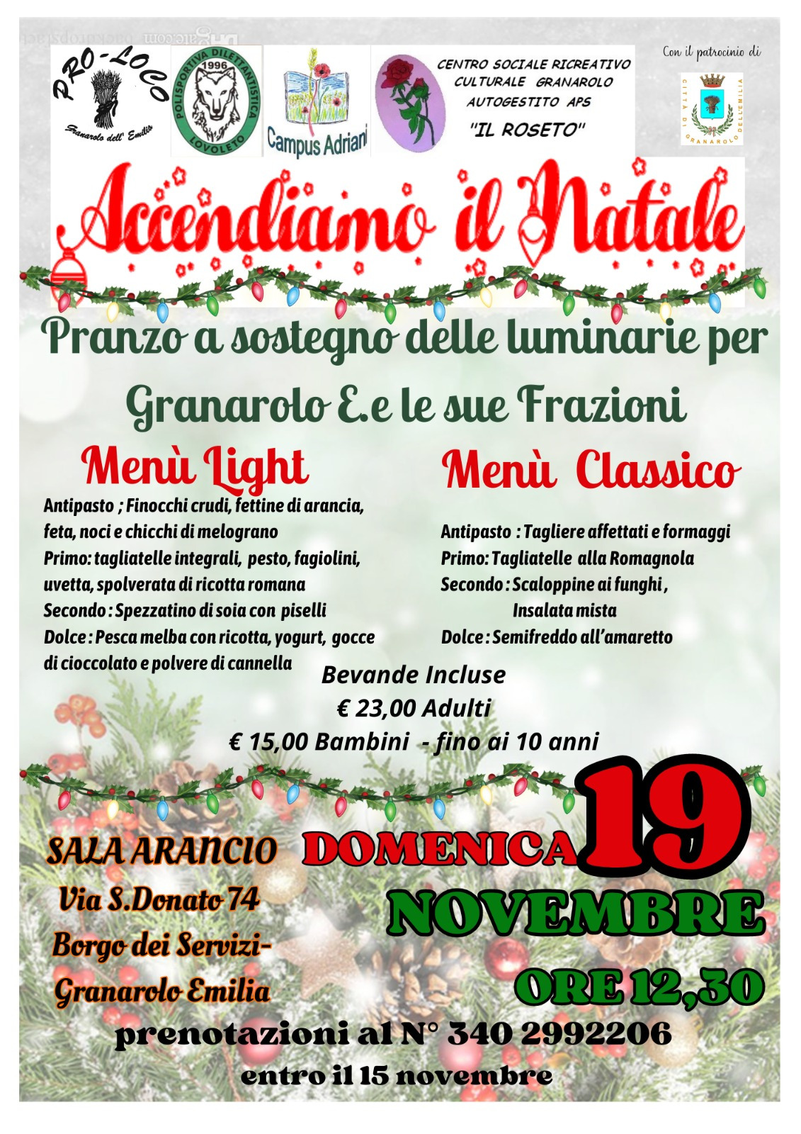 Domenica 19 novembre Pro-Loco Granarolo Dell'Emilia, Polisportiva dilettantistica Lovoleto, Campus Adriani e Il Roseto Centro Sociale, con il patrocinio dell'Amministrazione comunale, organizzano il pranzo "Accendiamo il Natale", alle ore 12.30 in Sala Arancio al Borgo Servizi.