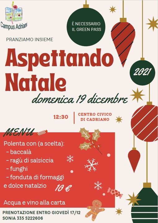 Domenica 19 dicembre, alle ore 12.30, l’associazione Campus Adriani, organizza il pranzo “Aspettando Natale”, presso il Centro civico di Cadriano (via Massarenti 1).