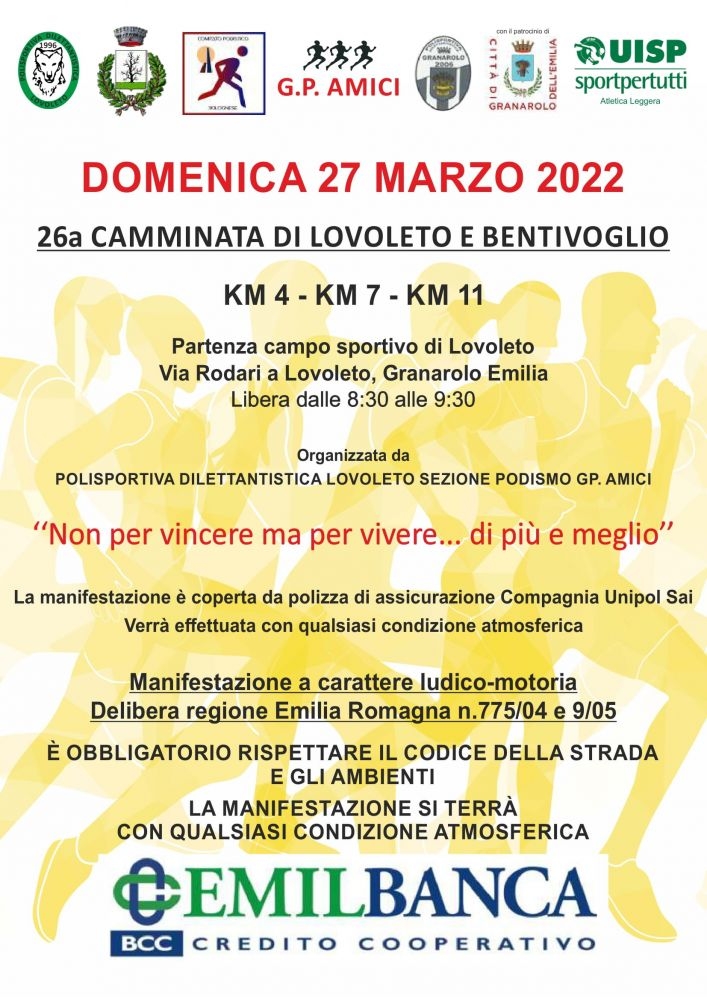Torna la Camminata di Lovoleto e Bentivoglio, manifestazione ludico-motoria. La 26^ edizione si tiene domenica 27 marzo, organizzata dalla Polisportiva dilettantistica Lovoleto e dalla Sezione Podismo GP Amici. La partenza avverrà dal campo sportivo di Lovoleto, in via Rodari. La camminata libera si svolgerà dalle 8.30 alle 9.30.