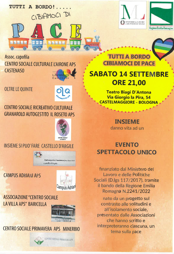 Il Centro sociale culturale L'Airone APS Castenaso come associazione capofila insieme a Oltre le quinte, Centro sociale ricreativo culturale Granarolo autogestito il Roseto APS, Insieme si può fare Castello d'Argile, Campus Adriani APS, Associazione "Centro sociale La Villa APS" Baricella, Centro sociale primavera APS Minerbio dà vita ad un evento spettacolo unico finanziato dal Ministero del Lavoro e delle Politiche Sociali tramite il bando della Regione Emilia Romagna N.2241/2022 nato da un progetto sul contrasto alle solitudini e all'isolamento sociale, presentato dalle Associazioni che hanno scritto e interpreteranno ciascuna, un tema sulla pace.