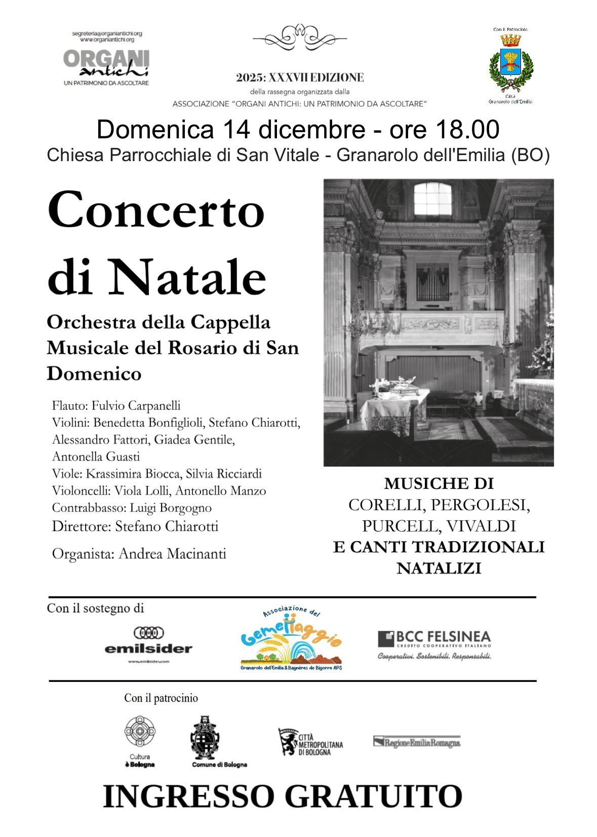 Il tradizionale appuntamento musicale natalizio attende la comunità di Granarolo dell’Emilia: domenica 14 dicembre, alle ore 18, la Chiesa Parrocchiale di San Vitale ospiterà il Concerto di Natale, inserito nella XXXVII edizione della rassegna “Organi antichi: un patrimonio da ascoltare”.