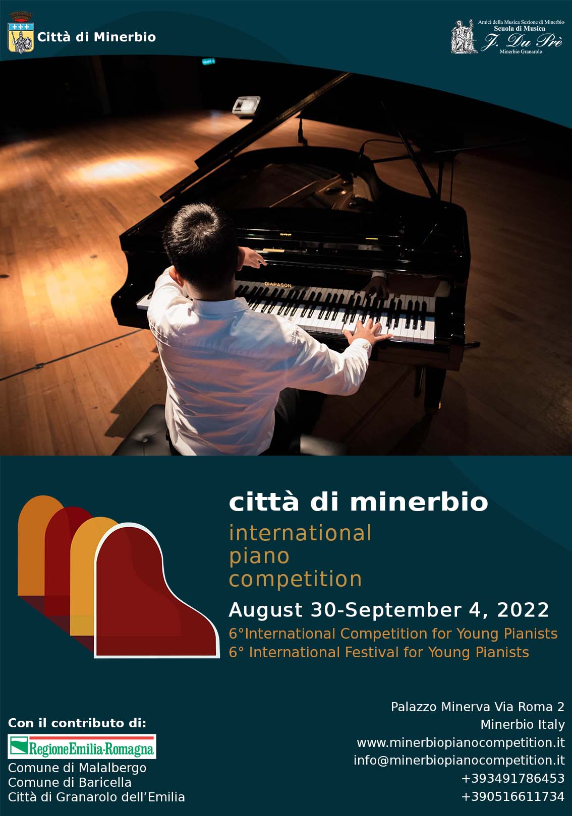 Dal 30 agosto al 4 settembre 2022 la Città di Minerbio ospita la sesta edizione del Concorso Pianistico internazionale "Città di Minerbio": un calendario ricco di concerti diffusi per il territorio minerbiese e nei comuni limitrofi di Baricella, Granarolo dell'Emilia e Malalbergo.
