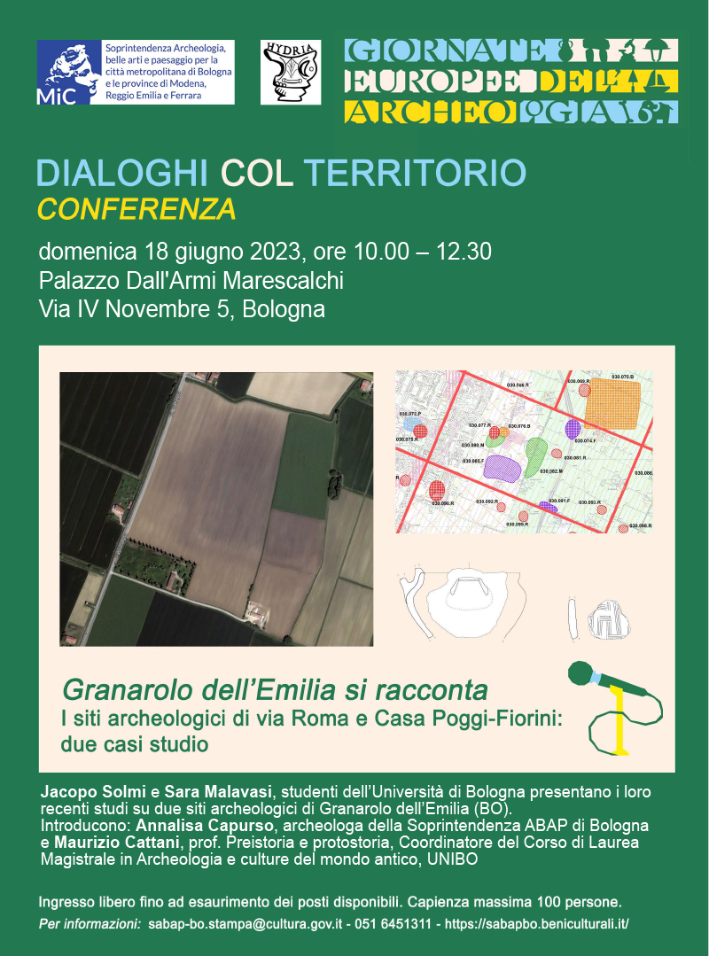 Domenica 18 giugno si tiene a Bologna, a Palazzo Dall'Armi Marescalchi (via IV novembre 5), dalle ore 10 alle 12.30, la conferenza "Granarolo dell'Emilia si racconta - I siti archeologici di via Roma e Casa Poggi-Fiorini: due casi studio".