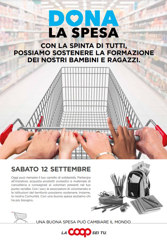 Sabato 12 settembre invitiamo la cittadinanza a partecipare all’iniziativa "Dona la spesa", nel punto vendita Coop di Granarolo: acquistando prodotti scolastici e materiale di cancelleria, da consegnare poi ai volontari presenti nel punto vendita, compiremo un gesto di solidarietà a favore delle famiglie più bisognose della Comunità.