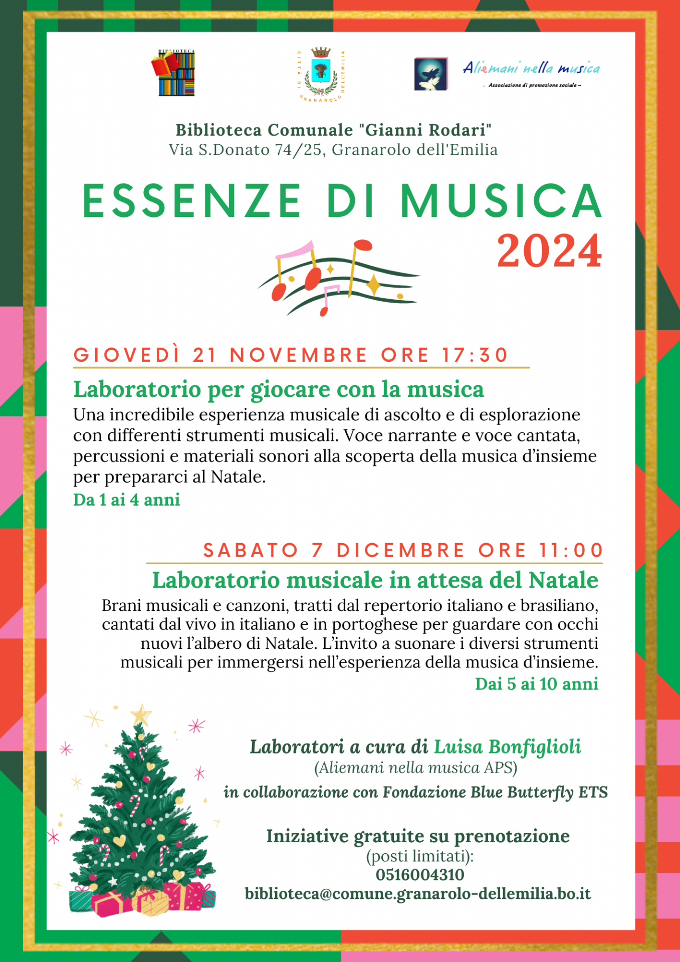 La Biblioteca Comunale "Gianni Rodari" propone due imperdibili laboratori musicali per bambini, ideati per far vivere un'esperienza musicale creativa e coinvolgente in vista del Natale. Gli eventi, a cura di Luisa Bonfiglioli dell'associazione "Aliemani nella musica APS" e in collaborazione con la Fondazione Blue Butterfly ETS, sono gratuiti e su prenotazione.