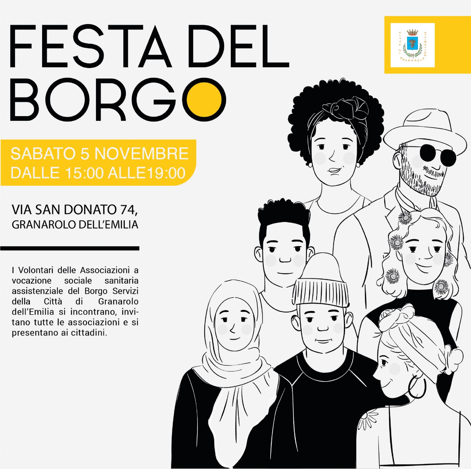 Sabato 5 novembre, dalle 15 alle 19, i volontari delle tante associazioni a vocazione sociale sanitaria assistenziale che hanno la sede al Borgo Servizi della Città, in via San Donato 74, si incontrano per fare festa con i cittadini e invitano tutte le associazioni di Granarolo che lo desiderano a unirsi a loro.
