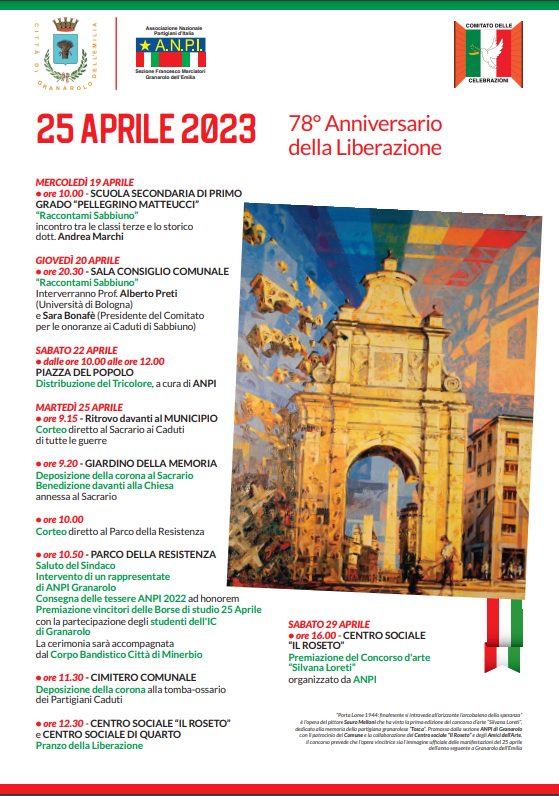 Dopo la benedizione davanti alla chiesa, alle 10 il corteo si dirigerà al Parco della Resistenza dove, alle 10.50, dopo un saluto del sindaco Alessandro Ricci, è previsto l’intervento di un rappresentante dell’ANPI di Granarolo, la consegna delle tessere 2022 ad honorem e la premiazione dei vincitori della “borsa di studio 25 Aprile”, “finalizzata a trasmettere i valori della Resistenza, dell’antifascismo e della pace, nonché a rafforzare i sentimenti d’appartenenza alla Repubblica Italiana”, con la partecipazione degli studenti dell'IC di Granarolo.