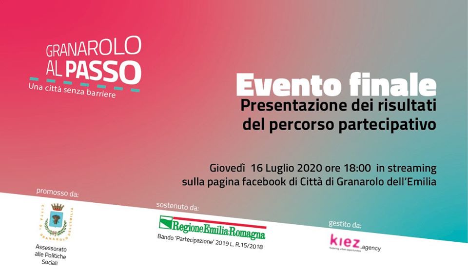 Giovedì 16 luglio dalle ore 18.00 alle 19.00 potrai assistere alla diretta streaming sulla pagina Facebook Città di Granarolo dell’Emilia in cui verranno raccontati i risultati emersi dal percorso ‘Granarolo al passo’