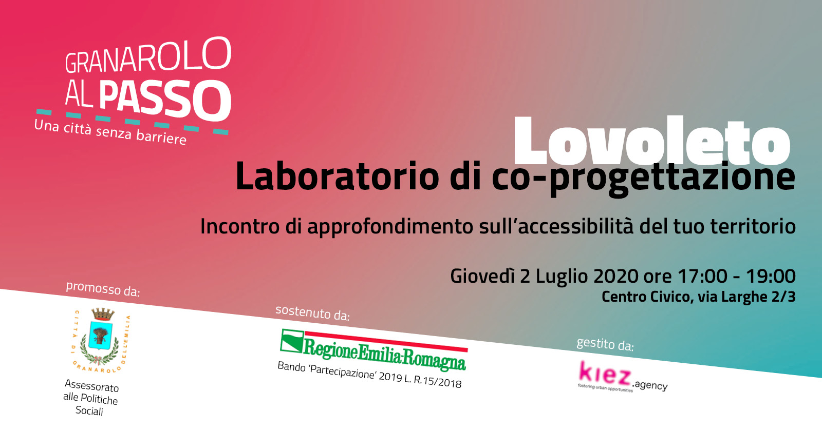 Giovedì 2 luglio, dalle ore 17 alle ore 19:00, si terrà il Laboratorio di co-progettazione su Lovoleto, nel giardino del Centro Civico, in via Larghe 2/3 a Lovoleto.