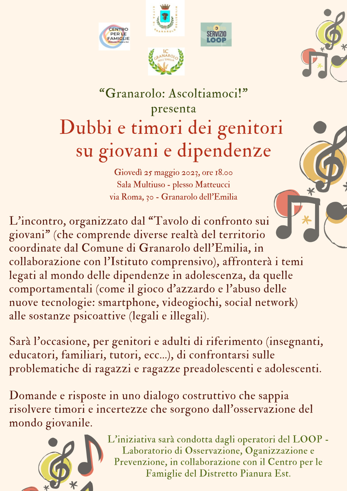 L’iniziativa, diretta e condotta dal LOOP (Laboratorio di Osservazione Organizzazione Prevenzione), ha per titolo "Dubbi e timori dei genitori su giovani e dipendenze" ed rivolta a genitori e adulti di riferimento (insegnanti, educatori, familiari, ecc.), intende affrontare i temi legati al mondo delle dipendenze in adolescenza, da quelle comporta mentali (ad esempio gioco d’azzardo e nuove tecnologie: smartphone, video giochi, social network) alle sostanze psicoattive (legali e illegali).