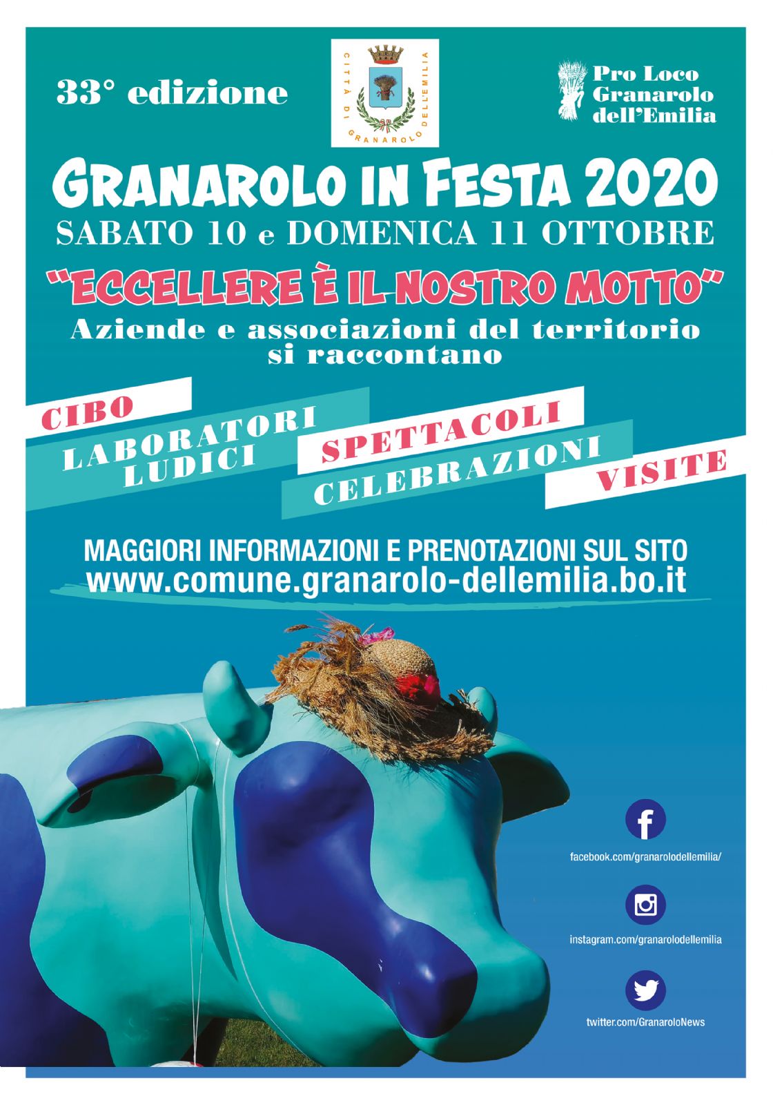 Granarolo in Festa 2020 sarà una due giorni di attività, iniziative ed eventi coordinati dal Comune di Granarolo dell’Emilia, diffusi tra capoluogo e frazioni e realizzati dalle Eccellenze del territorio, Aziende e Associazioni che hanno ideato proposte originali per raccontarsi e far conoscere la propria storia e le proprie peculiarità. Due giorni di ottimo cibo, laboratori ludici, incontri formativi, spettacoli, celebrazioni, visite per celebrare insieme Granarolo dell’Emilia!