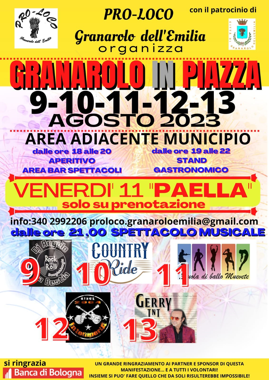 Dal 9 al 13 agosto torna "Granarolo in Piazza", la festa estiva organizzata dalla Pro-Loco di Granarolo dell'Emilia con il patrocinio del Comune.