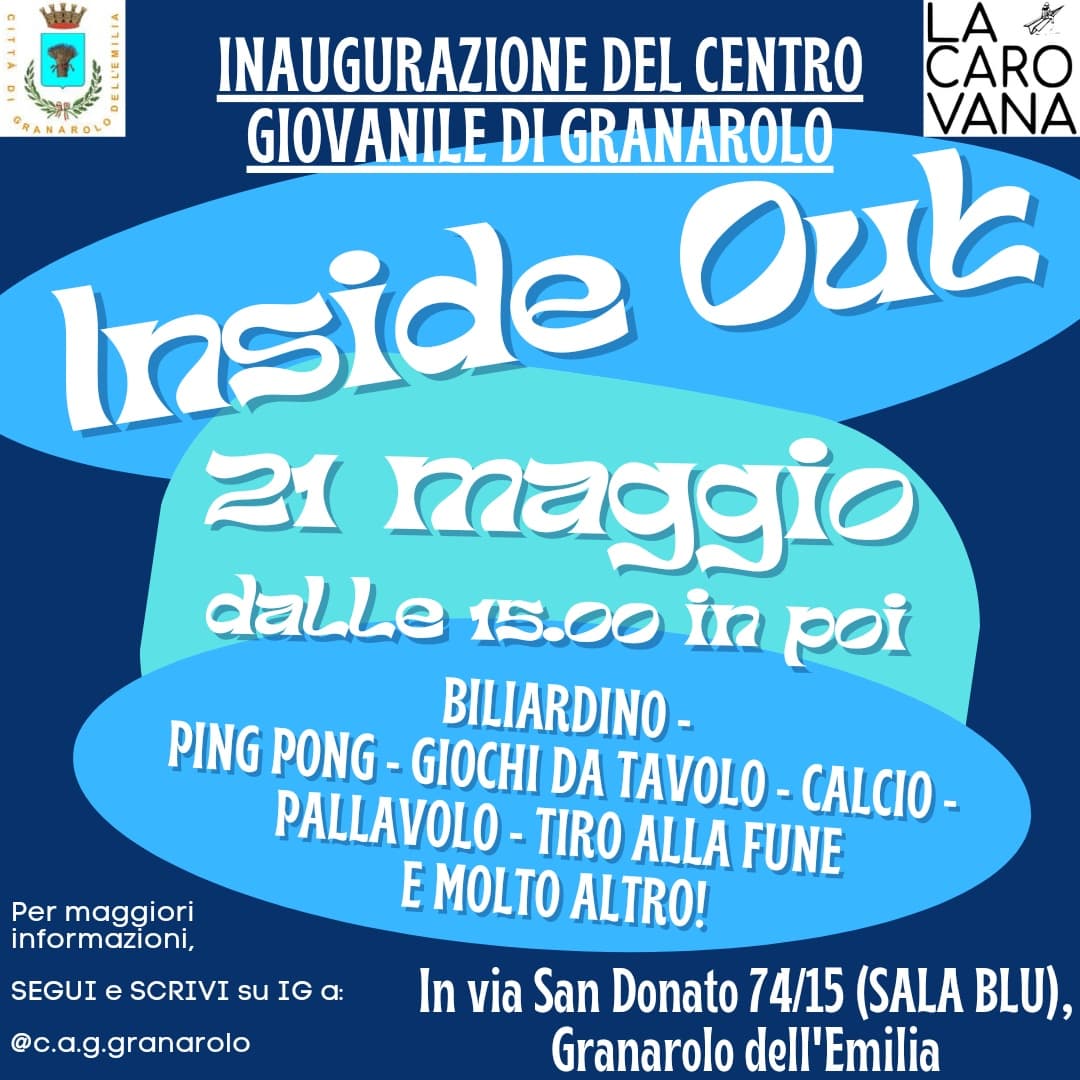 Sabato 21 maggio, dalle ore 15, si tiene la prima festa del nuovo Centro giovani di Granarolo, nella Sala Blu del Borgo Servizi. Sarà l'occasione per l'inaugurazione ufficiale e per il battesimo: "Inside Out" è il nome scelto per il Centro Giovani.