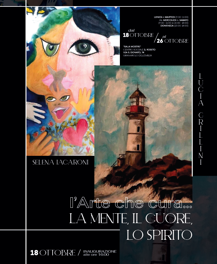 Dal 18 al 26 ottobre, la Sala Mostre del Centro Sociale “Il Roseto” (via San Donato 74) ospita “L'Arte che cura... La mente, il cuore, lo spirito”, la nuova esposizione personale di Selena Iacaroni, artista che esplora, attraverso la pittura, le connessioni tra emozioni, pensiero e interiorità.