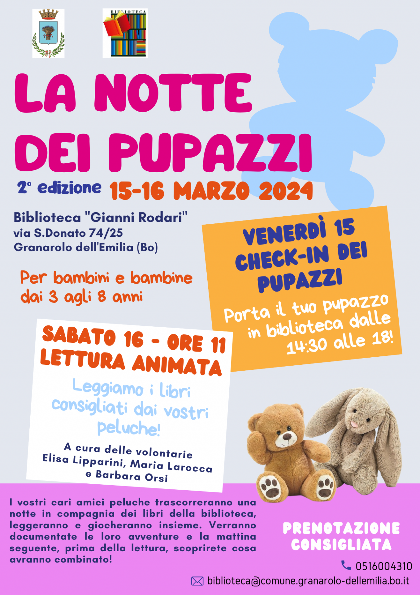Dalle 14.30 alle 18 di venerdì 15 ci sarà il "check in" dei pupazzi, con la consegna ai bibliotecari. I peluche trascorreranno la notte nei locali della biblioteca, leggeranno e giocheranno insieme. Poi, dalla 11 di mattina di sabato 16, le volontarie Elisa Lipparini, Maria Larocca e Barbara Orsi, leggeranno ai bimbi i libri consigliati dai peluche. Insieme si vedranno poi le immagini di ciò che i pupazzi hanno fatto durante la notte avventurosa in biblioteca!