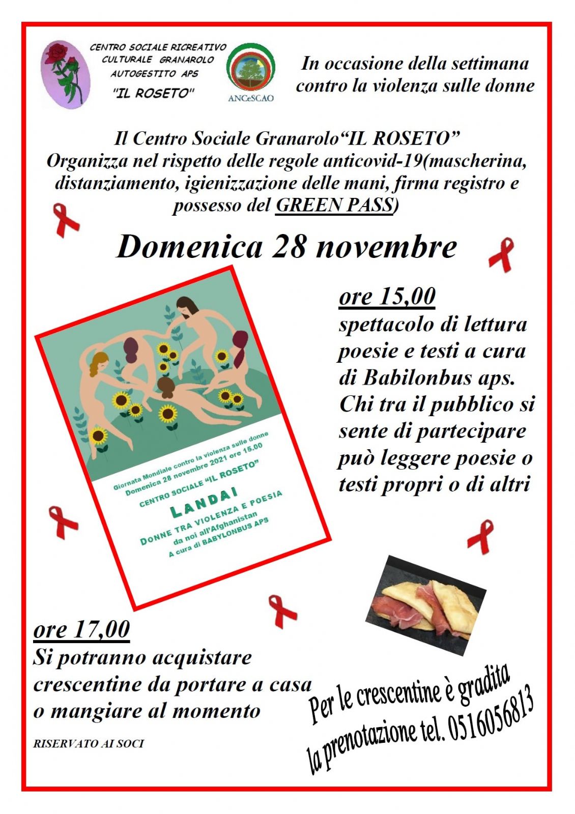 Alle ore 15 presso il Centro sociale Il Roseto si terrà una lettura di poesie e brani delle donne afgane, a cura dell’associazione Babilonbus. Dalle ore 17 sarà possibile acquistare crescentine da portare a casa o consumare al momento, nel...