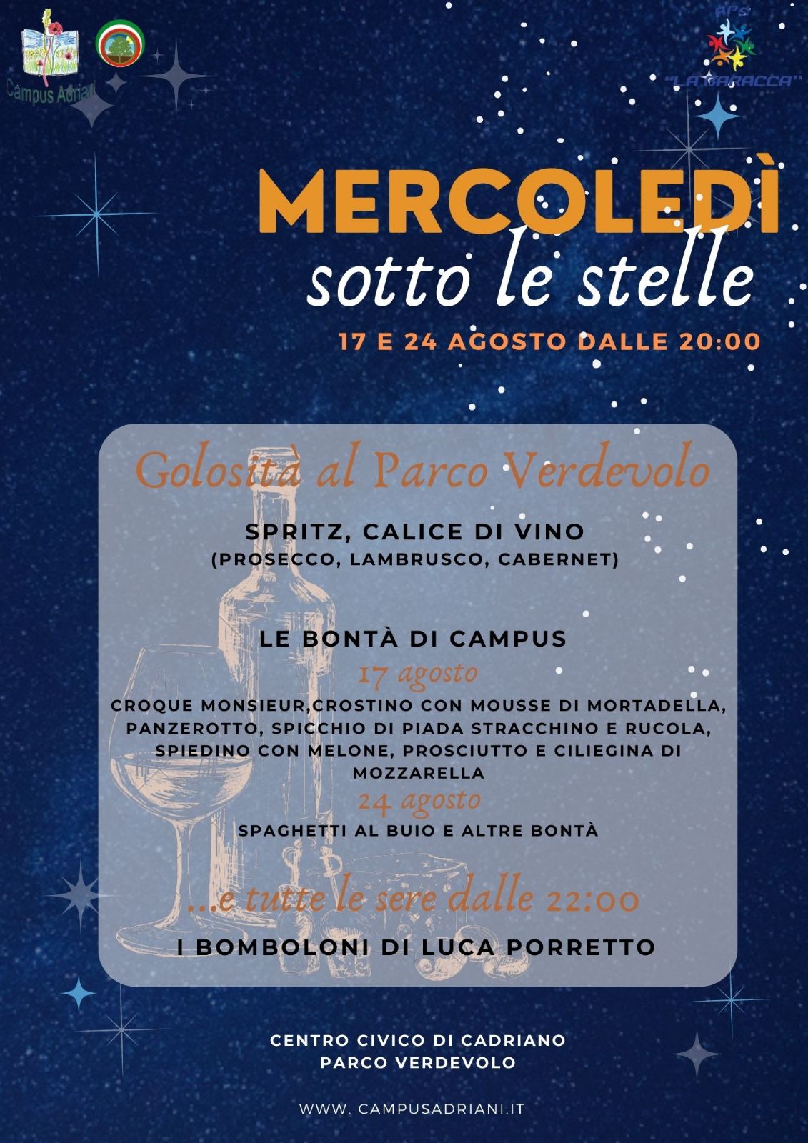Per le serate dal titolo "Mercoledì Sotto Le Stelle", organizzate da Campus Adriani APS in collaborazione con La Baracca APS, al Parco Verdevolo di Cadriano mercoledì 24 agosto, a partire dalle ore 20, serata dedicata a “Spaghetti al buio e altre bontà”.