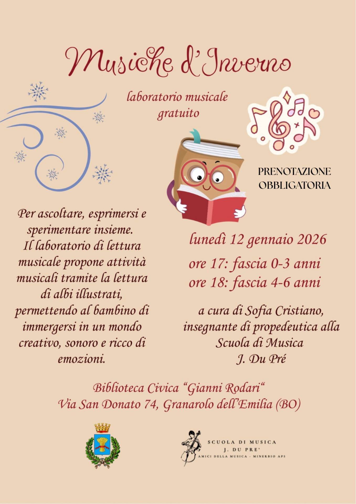 Lunedì 12 gennaio 2026 la Biblioteca Comunale “Gianni Rodari” ospita "Musiche d’Inverno", un laboratorio musicale gratuito dedicato ai più piccoli, organizzato in collaborazione con la Scuola di Musica Du Prè, pensato per ascoltare, esprimersi e sperimentare insieme attraverso la musica e la lettura.