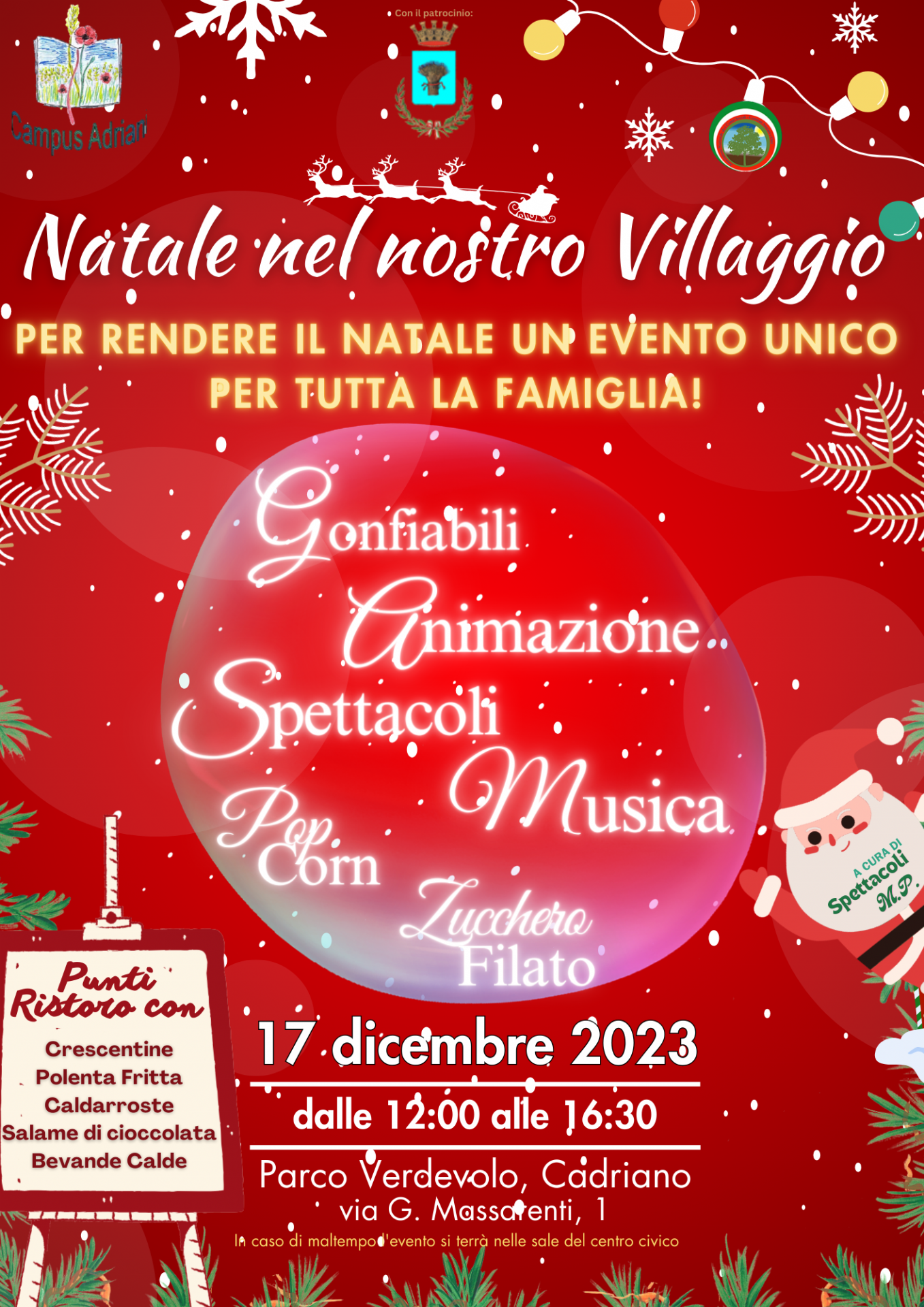 Domenica 17 dicembre, dalle ore 12 alle 16.30, presso il Parco Verdevolo di Cadriano (via Massarenti 1) sarà la volta di "Natale nel nostro Villaggio", un pomeriggio per le famiglie, organizzato da Campus Adriani, con spettacoli, musica, gonfiabili, animazione e punti ristoro.