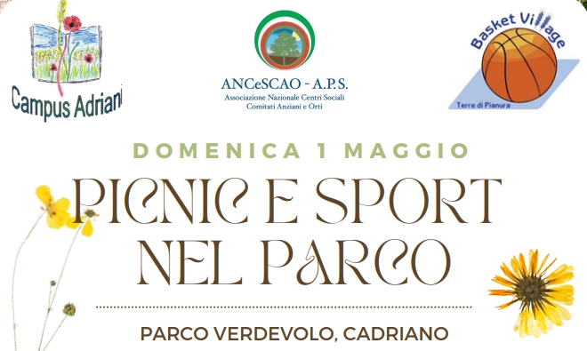 Domenica 1 maggio, dalle 10 alle 18, si tiene l'evento "Picnic e Sport nel Parco" al parco Verdevolo di Cadriano, organizzato da Campus Adriani, ANCeSCAO e Basket Village.