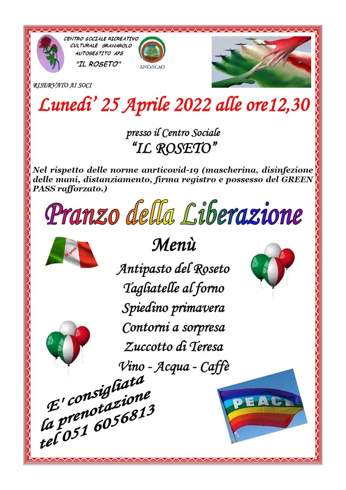 Il centro sociale Il Roseto organizza per i propri soci il Pranzo della Liberazione, lunedì 25 aprile alle ore 12.30. Si consiglia la prenotazione allo 051-6056813.