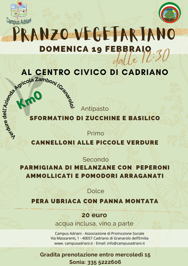 Domenica 19 febbraio, dalle ore 12.30 presso il centro civico di Cadriano in via Massarenti 1, l'associazione Campus Adriani organizza un pranzo vegetariano con verdure a km 0, proveniente dall'azienda agricola Zamboni di Granarolo. Il costo del pranzo (il menù nel pdf allegato) è di 20 euro, dall'antipasto al dolce (vino  a parte). È gradita la prenotazione entro mercoledì 15 febbraio (Sonia: 335-5222606).