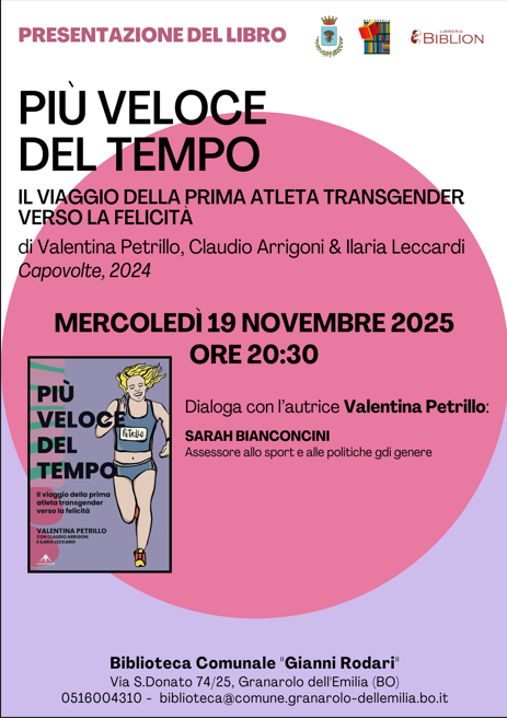 La Biblioteca Comunale Gianni Rodari ospita mercoledì 19 novembre 2025, alle ore 20.30, la presentazione del libro “Più veloce del tempo. Il viaggio della prima atleta transgender verso la felicità” (Capovolte, 2024), scritto da Valentina Petrillo, Claudio Arrigoni e Ilaria Leccardi.