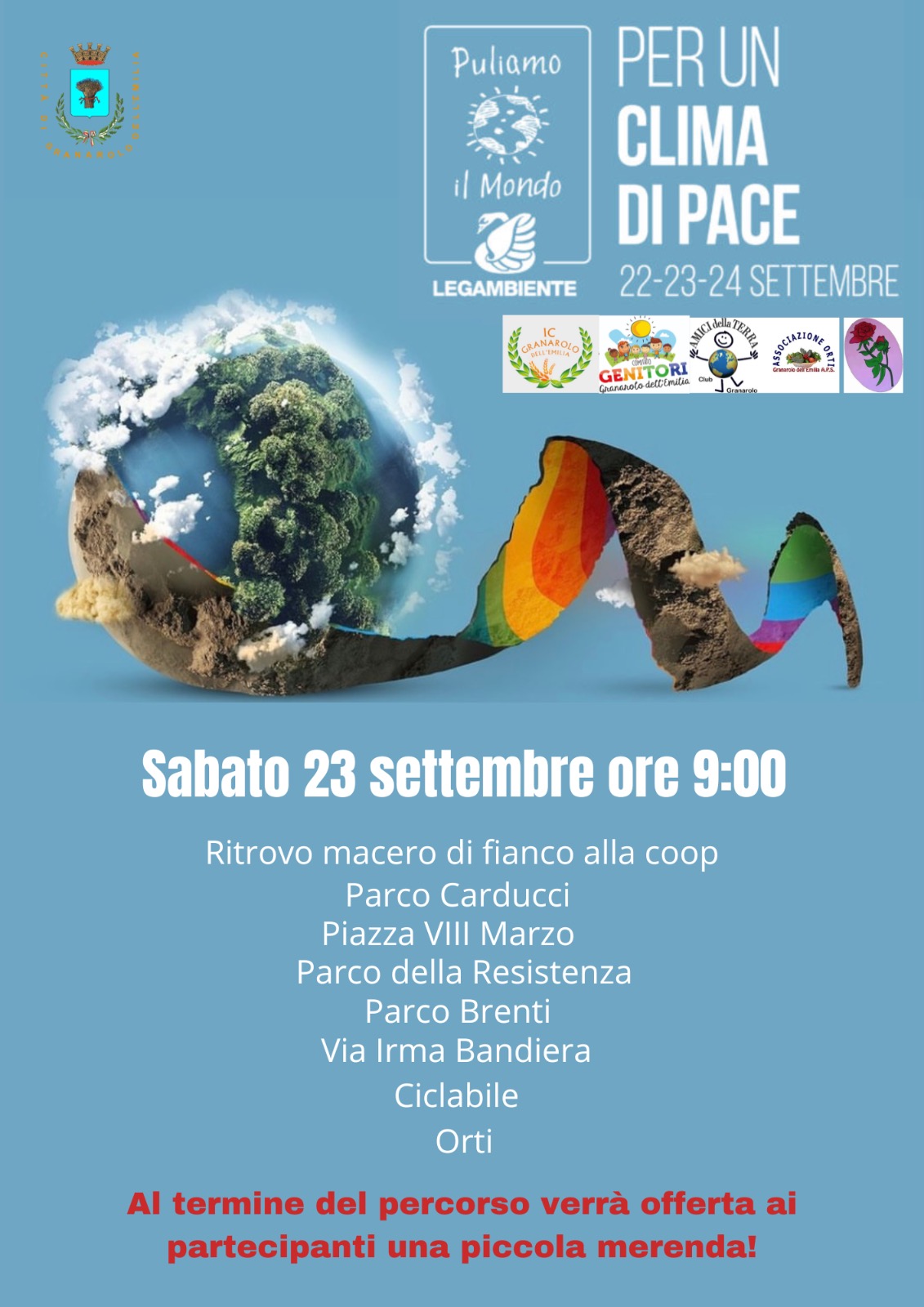 Sabato 23 settembre, dalle ore 9, anche a Granarolo "Puliamo il Mondo", con l'iniziativa promossa a livello nazionale da Legambiente. Si procederà alla pulizia di diversi luoghi del capoluogo e delle frazioni insieme a tutti ni volontari che vorranno unirsi. Ci saranno sicuramente i bambini dell'Istituto Comprensivo, il Comitato Genitori Granarolo dell'Emilia, gli Amici della Terra Granarolo dell'Emilia e l'Associazione Orti.
