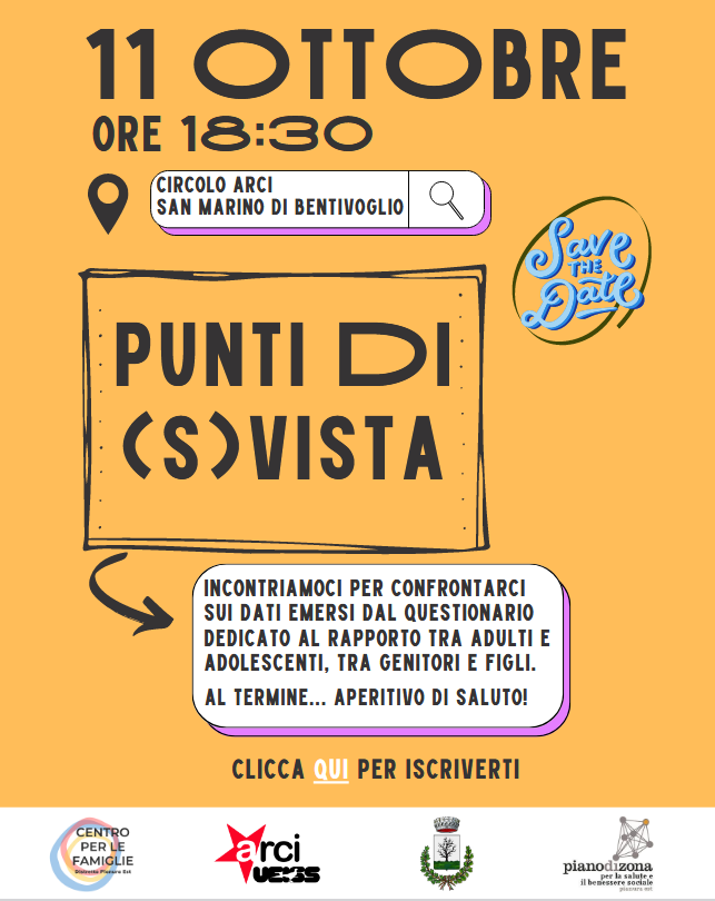 Nell'ambito del progetto Medi@azioni, finalizzato a confrontare opinioni e considerazioni nella relazione adulti e adolescenti, attraverso un questionario speculare rivolto ad entrambe le "categorie", il Centro per le Famiglie, in collaborazione con i giovani del Circolo Arci UEISS di San Marino di Bentivoglio, organizza PUNTI di (S)VISTA - incontro di restituzione - prioritariamente rivolto agli adulti - degli esiti dell'indagine e di riflessione condivisa sulla relazione tra generazioni.