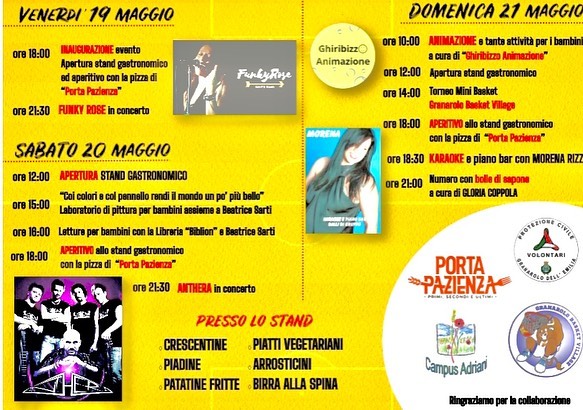 Venerdì 19 - A partire dalle ore 18 inaugurazione ed aperitivo gustando la pizza di Porta Pazienza; a seguire apertura stand gastronomico (crescentine, piadine, pasta vegetariana oppure al ragù, arrosticini); ore 21:30 Funky Rose in concerto.
